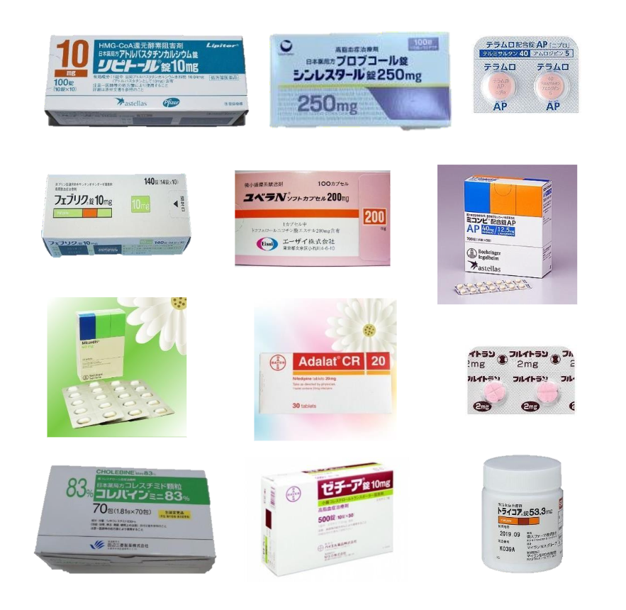 リピトール(アトルバスタチンカルシウム錠)、コレバイン(コレスチミド錠)、ゼチーア(エゼチミブ錠)、トライコア(フェノフィブラート錠)、ユベラ(トコフェロールニコチン酸エステルカプセル)、シンレスタール(プロブコール錠)、エパデール(イコサペント酸エチルカプセル)